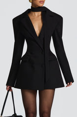 Elevate your look with the Vinnie Scarf in black. Crafted from non-stretch woven suiting fabric, this skinny scarf pairs seamlessly with tailored outfits, adding a refined touch around the neck.